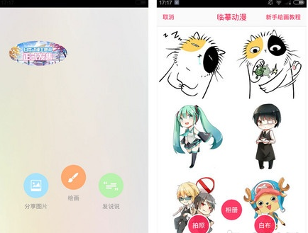 用户登录《画皮皮》后,可以点击“熊掌”分享图片、绘画或发表说说。其中最有意思的还是“绘画”功能,用户可以在这里临摹动漫,临摹自己相册中的图片,或者直接使用“白布”随心所欲的画画。第一次使用还可以查看新手绘画教程。