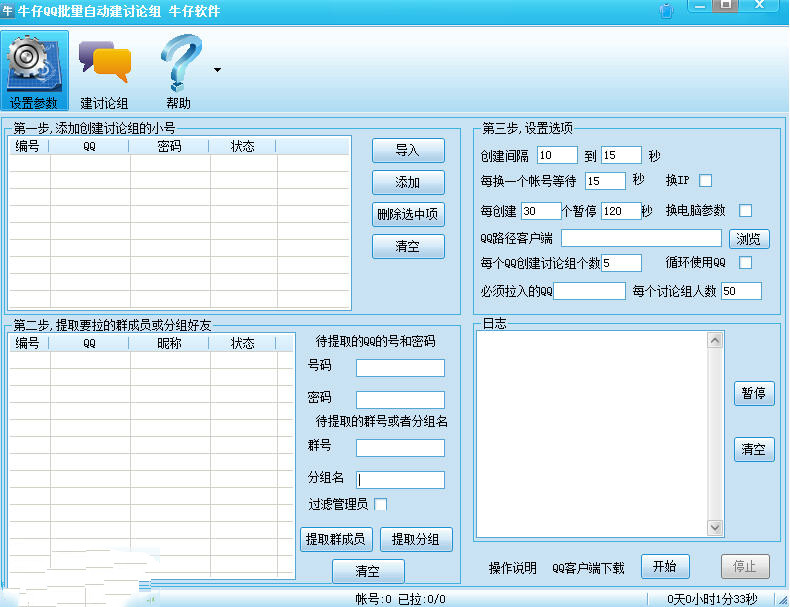 牛仔QQ批量自动建讨论组软件专为QQ营销推广人员制作,这款软件采用小号轮番登录QQ的方法,分批拉群成员或分组好友自动建立讨论组,该软件可过滤管理员,有效防止被踢,软件可挂机自动运行,解放您的双手,让你的效率变得更高。