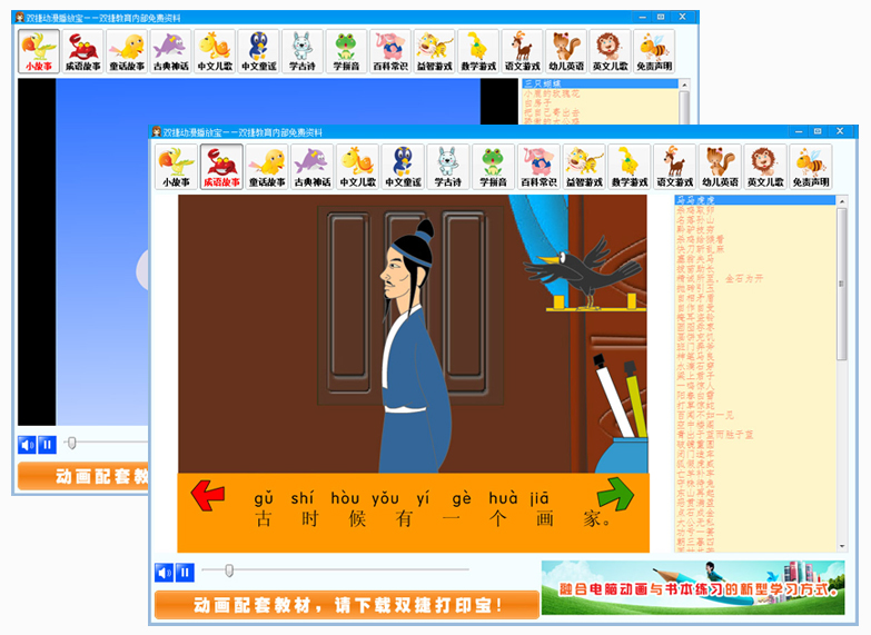双捷动漫播放宝是一款专为学龄前儿童推出的一款幼儿学习播放器,这款软件功能强大,操作简单。精心挑选和分类千个动漫故事包括小故事,成语故事,童话故事,神话故事,中文儿歌,中文童谣,学古诗,学拼音,百科常 识,益智游戏,数学游戏,语文游戏,幼儿英语,英文儿歌,14个单元。让儿童在看故事的过程中,获得大量的知识和快乐。