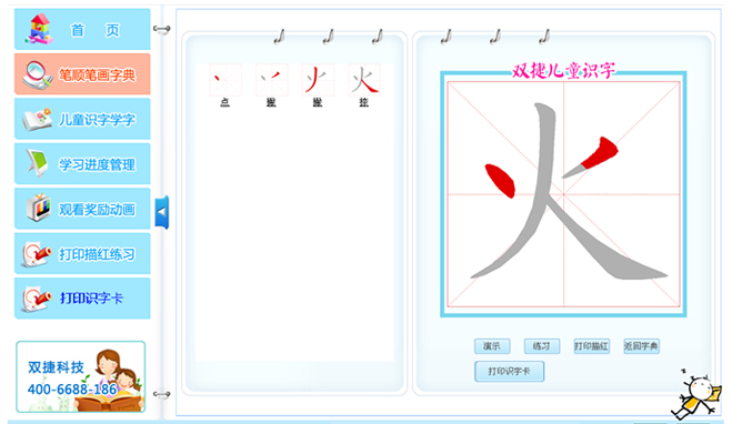 产品设计:双捷识字的动画简洁形象,排除干扰,贴近汉字字义和字形,均配上相应的儿歌朗读和解说词。
