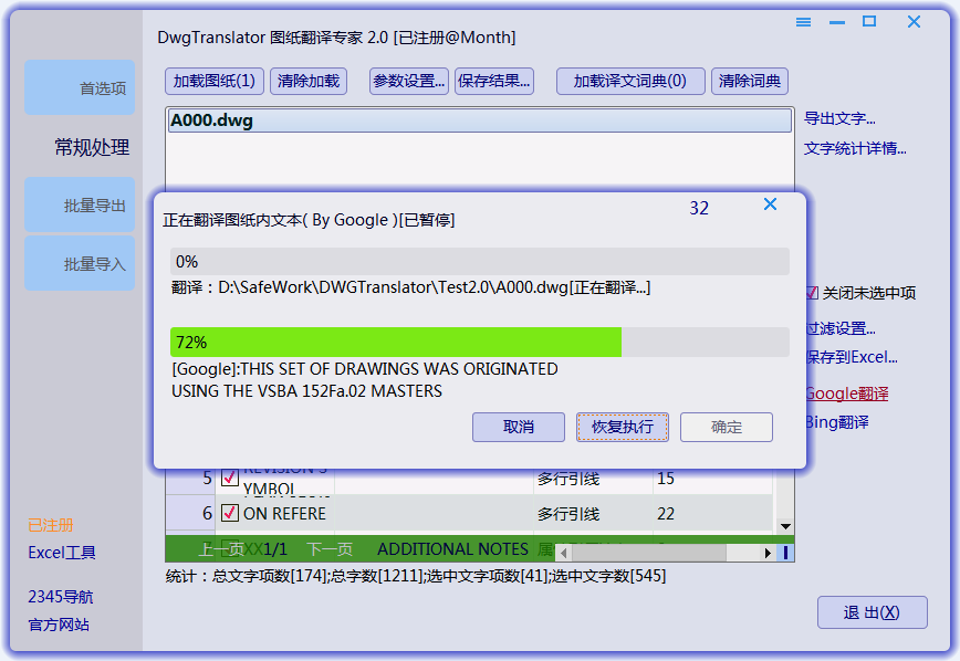 软件能自动分析所有文字条目(单行文本、多行文本、属性块,以及在这些基础属性之上构建的标准、块、表格等各种对象),能根据文字条目在图纸中的定位自动排序输出,方便译文操作。且会自动过滤掉非语言性字符串——比如数值等,自动忽略雷同文字条目。