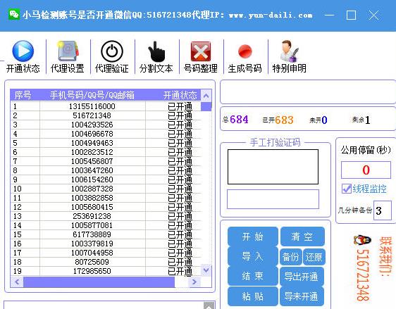 小马微信开通检测机是一款自动批量查询各类手机号、QQ号、邮箱号是否开通微信的检测工具,微信号开通,手机微信,QQ微信,邮箱号微信,微信查询。自动打码,一码二个,省钱啦;也可手工打码。软件为易语言编写,绿色免安装版本,误报是正常,请添加360信任。