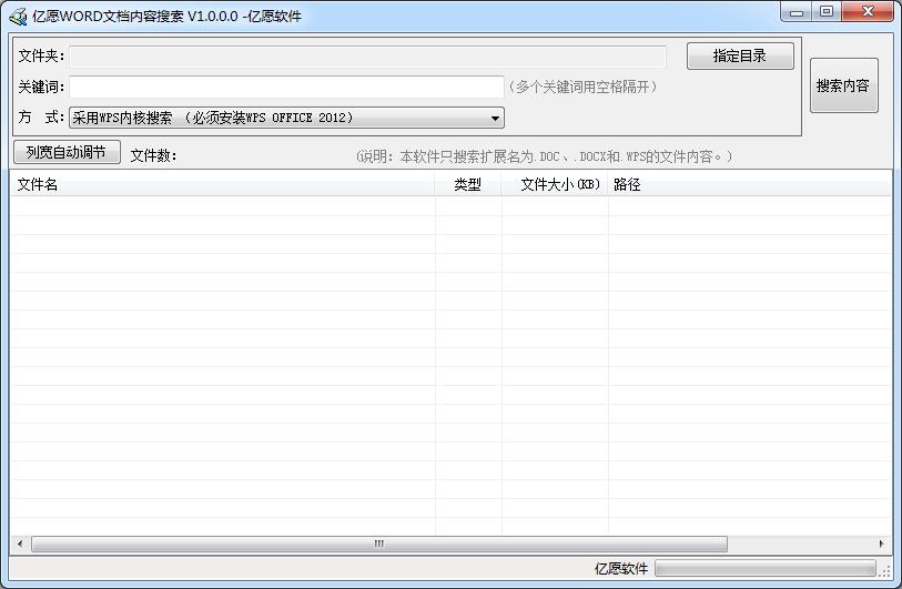 亿愿WORD文档内容搜索工具是一款绿色小巧、免费好用的文档搜索器,这款软件可以帮助用户搜索含有单个或者多个关键词的WORD文件(DOC文件、docx文件)、WPS文件和TXT文件的文本内容,让你无需逐个word文档打开搜索,方便又好用!软件为绿色软件,无需安装,解压缩后即可运行;免费软件,不含任何广告和插件,欢迎下载试用!