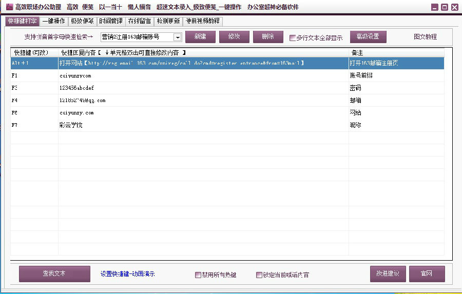 高效职场办公助理是由彩云学院最新的推出的一款专门针对办公人士开发的办公软件,这款软件功能全面、高效实用,高效职场办公助理内置了桌面便签,同时还可以帮助你进行时间管理、在线留言、一键操作、网址管理、文本录入功能等等,软件操作简单便捷,非常适合办公的小伙伴们使用,为你大大提高办公效率!