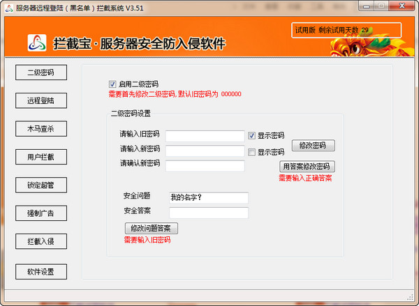 如果服务器的密码或网管的计算机名太简单被黑客猜测到,通过3389远程登陆时,开启“二级密码”功能,只有知道二级密码才可以远程进入服务器,双重保护,确保安全,本功能如忘二级密码可通过安装软件时设置的找回密码所填的问题与答案重置新密码.