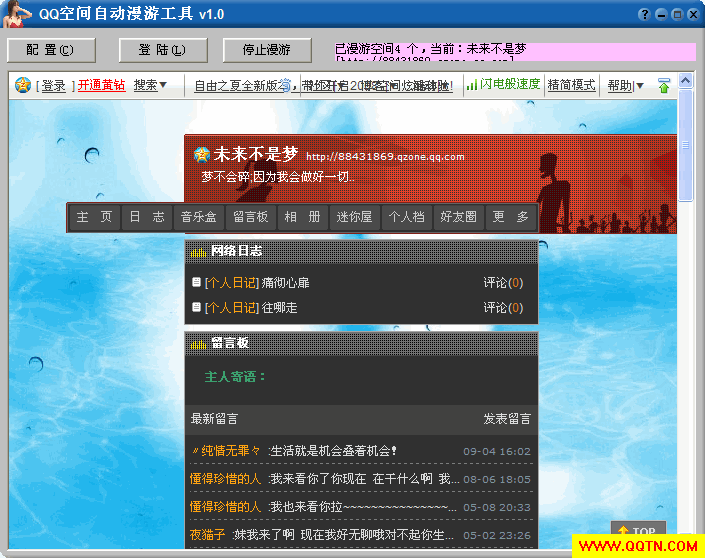 简单、高效的qq空间漫游软件!默认6秒刷一个空间,一小时可刷600个qq空间!操作极其简单,只需登陆-》开始漫游即可!全免费,无任何限制,想怎么刷就怎么刷!至少能给你带来30%的回访!自动随机选择空间!当qq空间不存在或需要密码访问时,自动用定制界面替换!