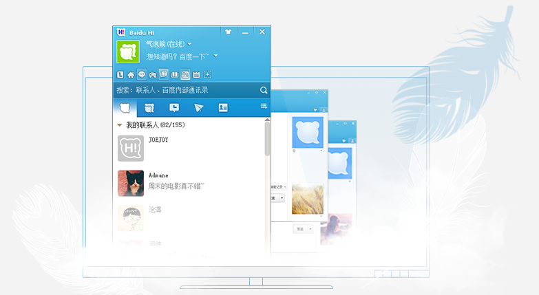 百度hi是一款集文字消息、语音视频通话、文件传输等功能的即时通讯软件。百度推出IM主要是希望把百度贴吧、百度空间、百度知道和百度百科等产品通过即时通信整合起来。百度Hi面板结合了百度搜索,支持网页搜索、图片