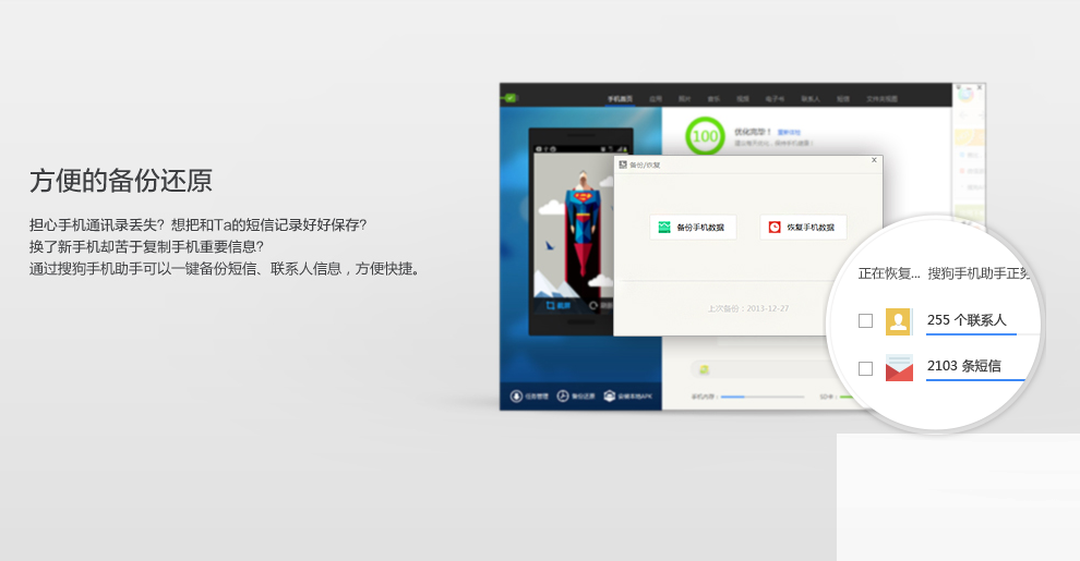 通过搜狗手机助手可以一键备份短信、联系人信息,方便快捷。