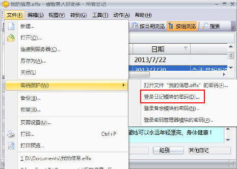 3.如果您想为日记模块加密,请单击文件->密码保护->登录日记模块的密码。