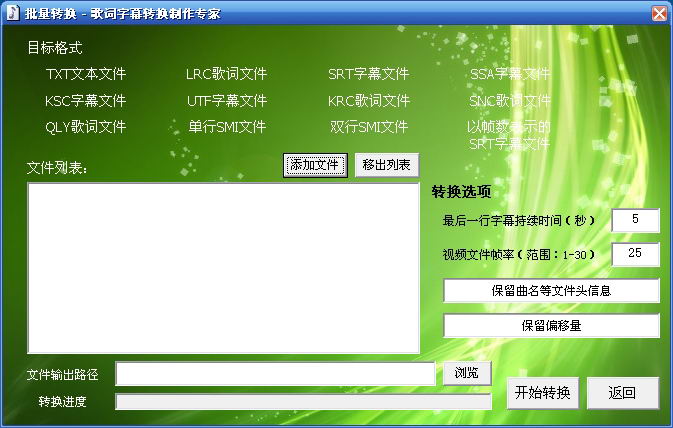 全面支持LRC、SRT、SSA、KSC、SMI、UTF、SNC、KRC、QLY、TXT等10种歌词字幕格式。随心所欲,想转就转。