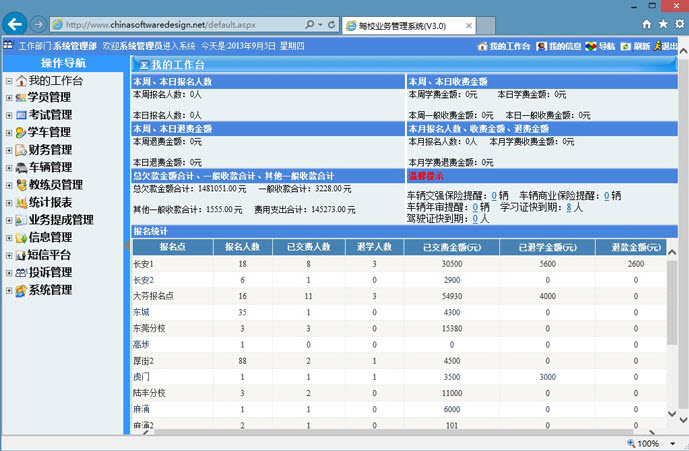5. 学员收费统计、欠费统计、学员欠费提示、学习证到期提醒。