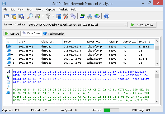 5、进来的数据包流,可以很容易地看到一个完整的数据交换的Telnet、POP3、SMTP、IMAP,FTP,HTTP和其他协议。