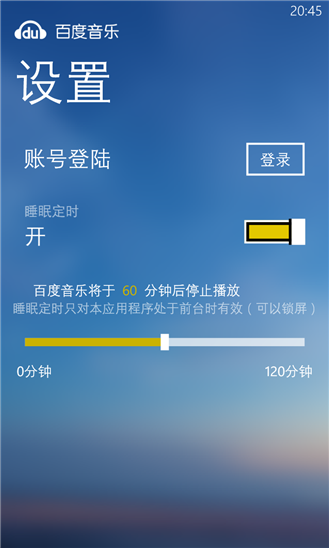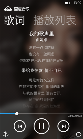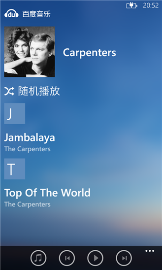 百度音乐全新推出完美契合WP系统风格的音乐应用,完美音质,流畅体验。在线音乐搜索,音乐排行版,音乐分类,歌手分类,新碟上架,本地音乐、在线音乐、个人音乐,页面内容更加丰富; 歌曲播放页功能更强大、界面更美观;百度音乐WP版,让你听到极致。