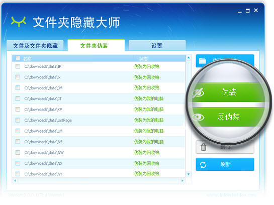 文件夹隐藏大师不像其他的文件/文件夹的隐藏软件,它可以隐藏多种可移动驱动器中的文件与文件夹。对我来讲非常有用处.文件夹隐藏大师能够快速安全的隐藏您指定的文件夹,支持本地硬盘以及多种usb移动设备的文件隐藏功能。同时文件夹隐藏大师还提供文件夹伪装功能能够按照您的指令将文件夹任意伪装成任何系统文件夹。秉承绿色软件的理念不需要进行安装就能使用,不会在您的系统中安装驱动或其他的文件。