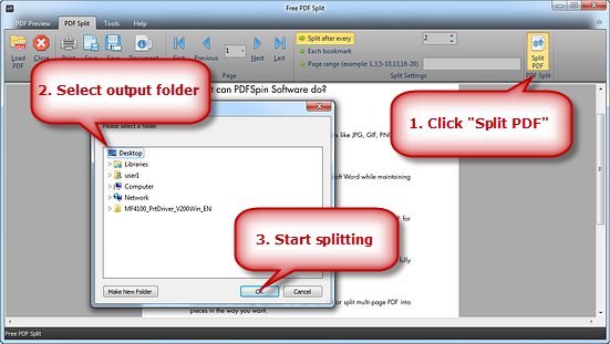 点击“split PDF”选择一个输出文件夹。单击“OK”和分割过程将在几秒钟内完成。