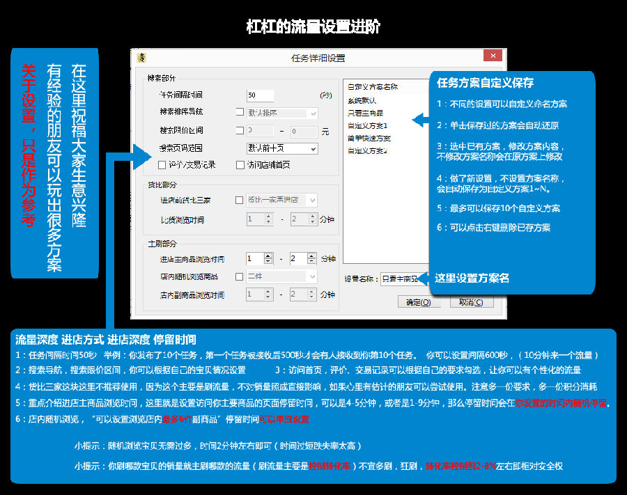 流量任务参数设置:流量深度、进店方式、进店深度、停留时间、任务方案自定义保存。