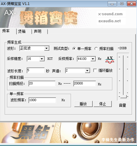 AX煲箱宝宝一款纯软件的音频信号发生器,通过用户设置频率生成新的音频频率使用户音箱音质效果变得更好,是一款很好的测试音箱频率响应的工具,软件免费使用,无需安装,操作很简单,能够快速准确的帮助用户设置一段适合自己音箱的频率。