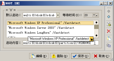 3、带了个简易的“文本编辑器”-用于编辑 BOOT.INI。因为在 98/2000/XP/2003 中 BOOT.INI 往往是“只读、系统、隐藏”的文件,在编辑时必须“显示系统文件”,且去掉相关的属性才能编辑保存,操作非常的不便。而“文本编辑器”在“保存”时会自动去掉原来的属性,是之可以正常的编辑,在保存后再恢复其原来的属性。