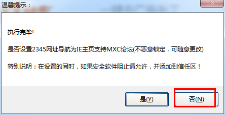 执行完毕——否(如果点“是”,程序将会帮你锁定IE主页)