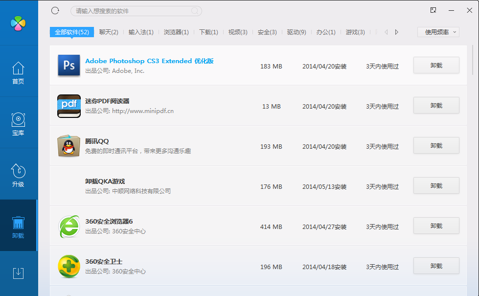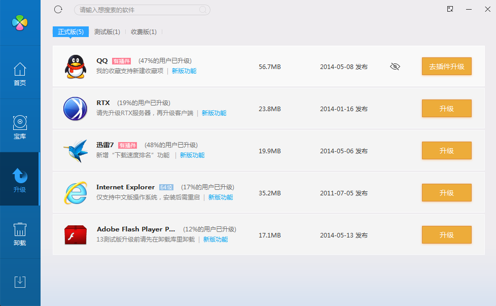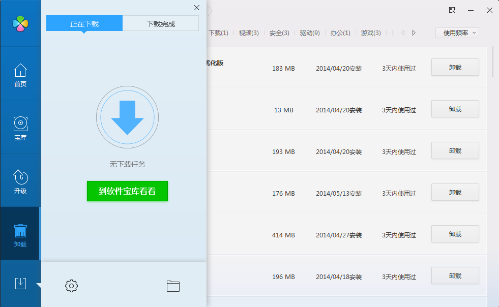 软件管家利用快速检测注册表从而获取安装过的软件信息,并将这些软件分类列表供用户方便查看。不仅这样,就一般而言软件管家都拥有庞大的软件数据库,提会推荐软件为用户作参考,方便用户搜索软件,并还能提示软件升