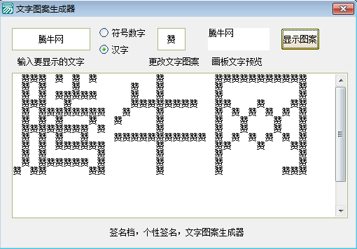 文字图案生成器可以将用户输入的文字转换成精美的图案,支持符号数字和汉字的生成转换,可以用户签名档、个性签名等文字图案生成。