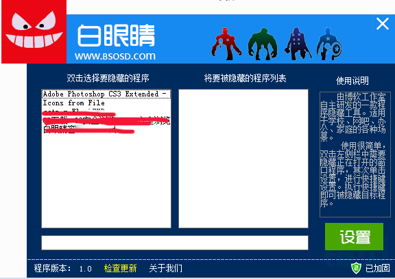 白眼睛程序隐藏工具是一款电脑运行程序隐藏工具,可以将系统中正在运行的程序隐藏起来,适合学校、家庭、网吧、办公室等多个不同场合使用。程序隐藏之后,还是在继续运行,程序不会关闭。将程序隐藏起来,干更多的事情!