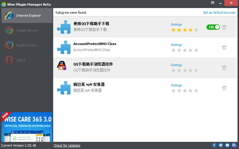 3、对扫描到的插件、加载项、工具条,Wise Plugin Manager会显示评分,这些评分来自于其他用户,可以作为非常好的参考。