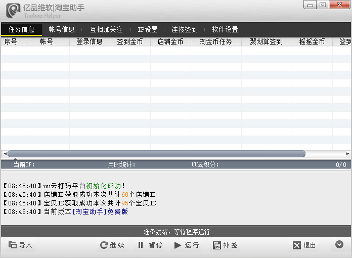 多帐号淘宝助手是一款多功能全自动帮助淘宝用户完成各种淘宝任务的一款辅助工具,可以每日自动一键完成淘金币任务、集分宝任务、淘宝抽奖等等,支持多帐号操作,适合那些拥有大量淘宝帐号的用户使用,工具功能齐全,十分智能,是淘宝达人必备工具!