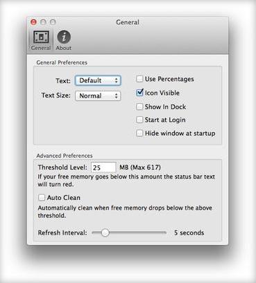 先进的选项让你设定一个阈值水平,当你的自由内存进入红。那就是,什么时候你想在菜单栏中的数字记忆清洁变成红色警告你,你的内存资源不足。还有一个盒检查有程序自动清除你的MAC的内存时,它低于阈值。