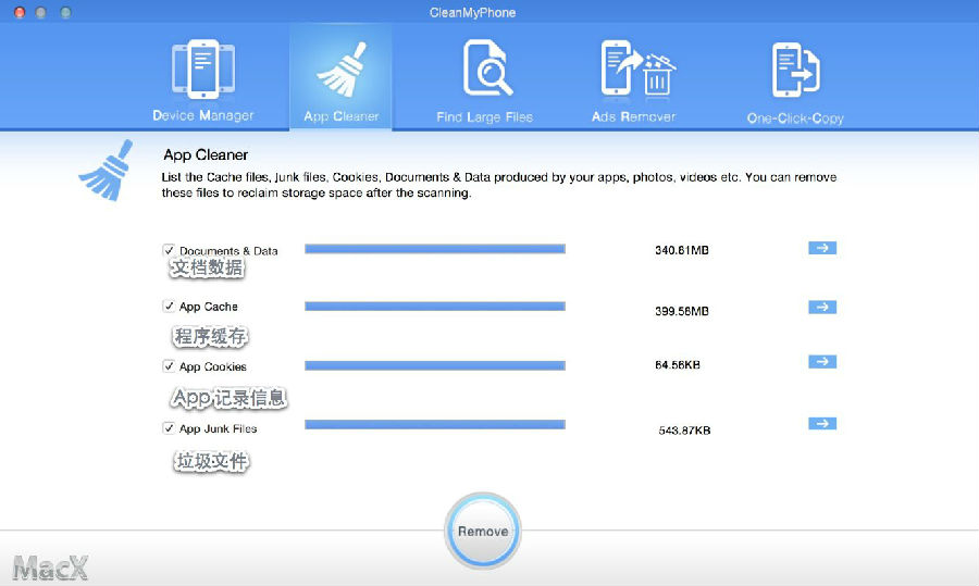 CleanMyPhone for Mac是款苹果电脑垃圾文件清理实用性很强的工具,还支持磁盘管理、应用卸载、删除文档数据、查找大文件等功能,CleanMyPhone的磁盘管理器可以帮助到你的iPhone ,iPad或iPod touch的配置清洁和顺利运行。,组织和管理文件和应用程序。你可以找出究竟占用你的磁盘空间并轻松导出,删除不需要的文件,或汇出,并从您的设备卸载不必要的应用程序。 回收存储空间,并保持您的iDevice运行平稳... CleanMyPhone应用程序清洁器可以帮助你去除像文档和数据,应用程序的Cookie各种临时和无用文件获得更多的存储空间,并在iOS设备上应用程序垃圾文件。