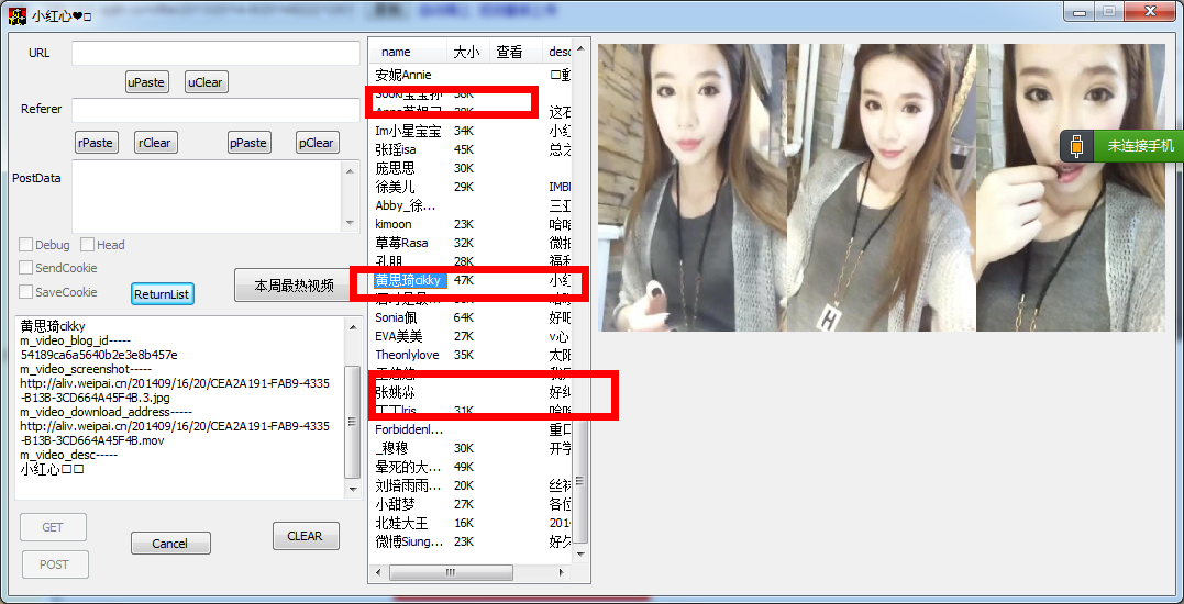 3、随便点击列表中的一个用户名,即可查看到对应的图片视频信息,左下侧就是微拍视频地址