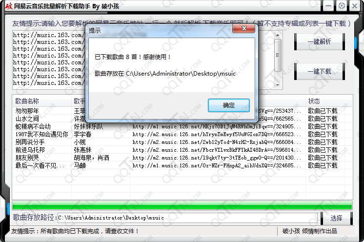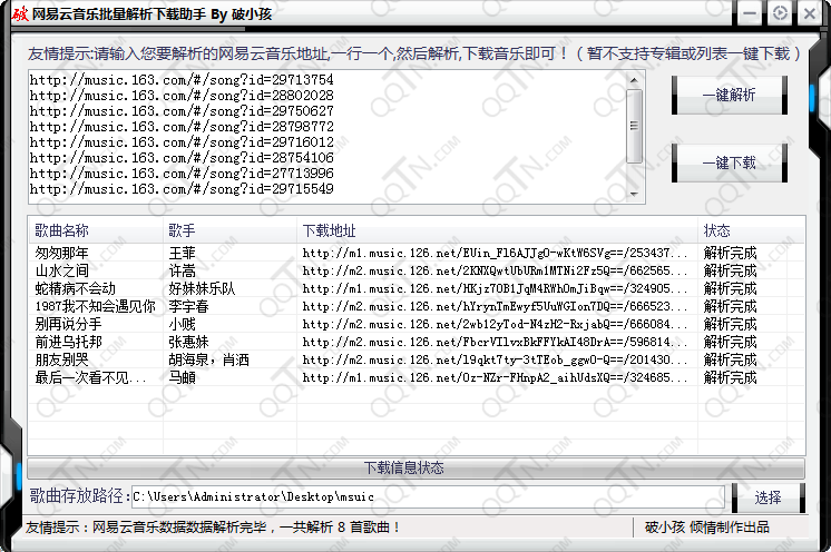 这是破小孩制作的一款用于网易云音乐批量解析下载工具,能够解析出网易云音乐歌曲真实地址,可以引用音乐外链,同时还能批量下载歌曲,无需安装客户端,就能轻松完成。需要的朋友下载试试吧!