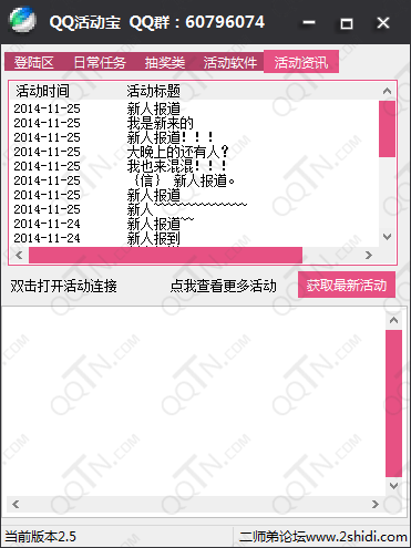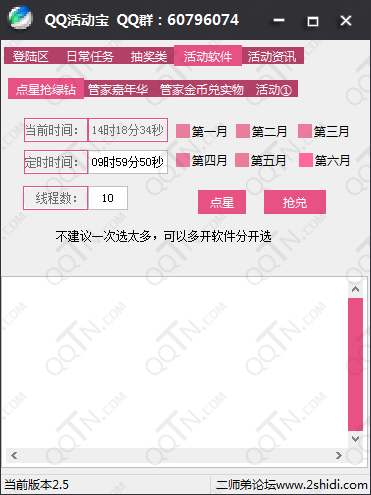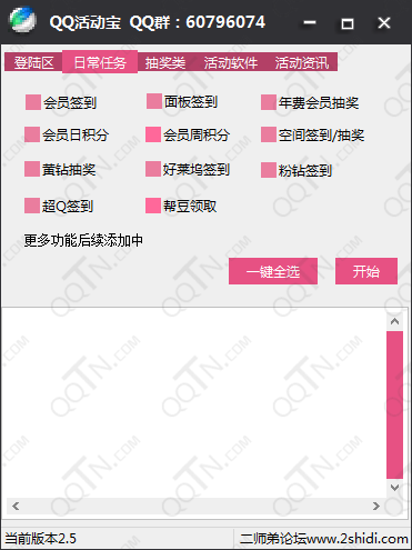 QQ活动宝,提供最专业最全面的QQ综合一站式解决方案。可以帮助QQ用户完成各种日常任务签到,如会员签到、黄钻签到、帮豆领取、空间签到等;活动每日自动抽奖;各类最新活动辅助软件,如点星抢绿钻等;还提供最新QQ活动咨询。QQ活动宝,拥有着及时丰富的内容,各种强大辅助软件,完全免费使用,绿色无广告,是目前最专业的一款QQ活动工具。
