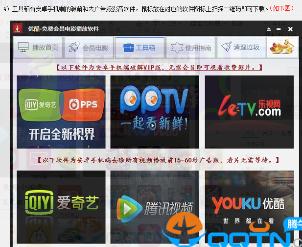 3、工具箱,提供爱奇艺pps、PPTV、乐视视频、爱奇艺视频、腾讯视频、优酷视频安卓手机端破解VIP版,无需会员即可观看收费影片。