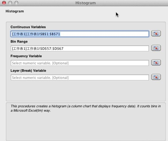 7,然后你就看到熟悉的数据选择界面了,第一行必选,就是选择你要统计的数据,点击右边的选择按钮,然后回到你刚才打开的excel,选择你需要统计的那列(电话费)即可。第二列就是接受条件那一列了,这项是可选的,不选它就自己给你分区间,也可以像老师教的那样选择自己的区间。最下面有个选项框,勾上就表示第一行是标题,不加入计算