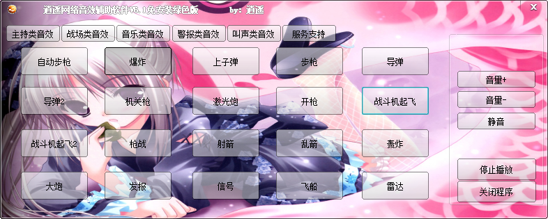 逍遥网络音效辅助软件是目前为止音效素材最多、最好用的一款音效辅助软件。软件提供了主持类音效、战场类音效、音乐类音效、警报类音效、叫声类音效等几大类音效。软件完全免费使用,同时可以自由调整音效的音量大小。