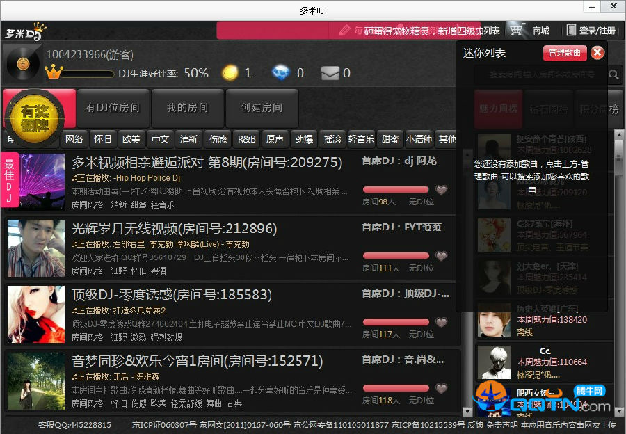 你可以通过播放共享自己的音乐,结识到志同道合的朋友,大家畅聊音乐体验以及感受。房间里的每个人对当前DJ的歌曲进行投票。如果你选择的歌曲得到赞成票,你得一分,反之如果太多人投了反对票,则跳到下一个DJ的歌曲。