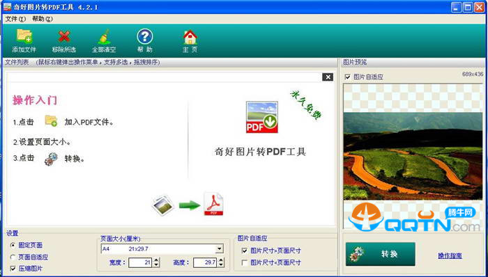 奇好图片转PDF软件是一款专门的图片格式转换器,它可以帮助用户轻松的将其他图片转换为PDF格式文件,它支持JPEG、PNG、BMP、GIF、WMF、EMF、EPS、TIFF等8种图片格式,同时它支持批量转换多张图片,并且这款软件完全免费,欢迎下载使用!