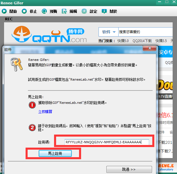1、下载安装好Renee Gifer动画秀官方原版软件,启动破解补丁,进入软件主程序,点击注册