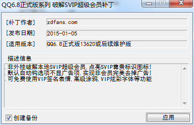 驱动人生8最新版v8.16.17.50 官方版QQ6.8正式版SVIP超级会员破解补丁适用于QQ6.8正式版13620及后续更新维护版本使用。本补丁主要帮你实现本地超级会员破解,享受超级会员一系列特权。而不是真正将超级会员破解了,目前没有这样的工具,也不可能有!