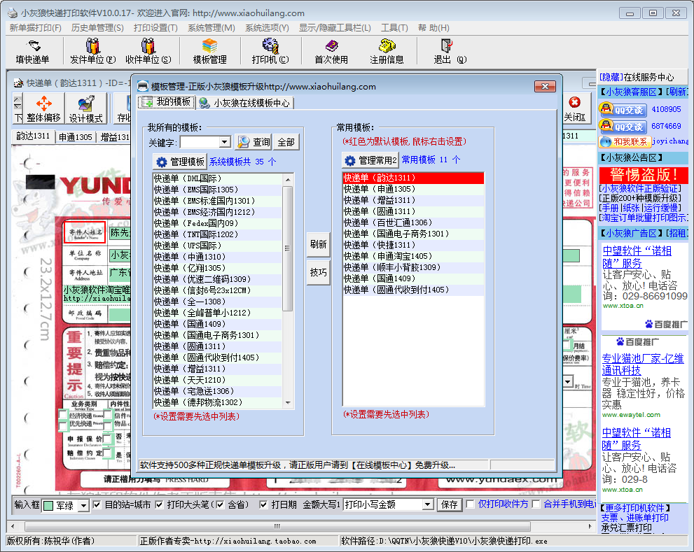 顺丰(国内国际)、全峰、申通、申通淘宝单、圆通、中通、国通、百世汇通、韵达、EMS邮政物流、EMS包裹、EMS电商、EMS大包小包单、EMS国际、UPS、DHL、Fedex联邦、TNT、DPEX、中速国际 、龙邦、海航天天、德邦、速尔、全日通、能达、越丰、彪记、盈飞、邮政包裹单、中诚、全一、飞康达、鑫飞鸿、长发、快捷、新邦、宅急送、YCC、奇速、晋越等200多种快递包裹单及其代收单据的打印。