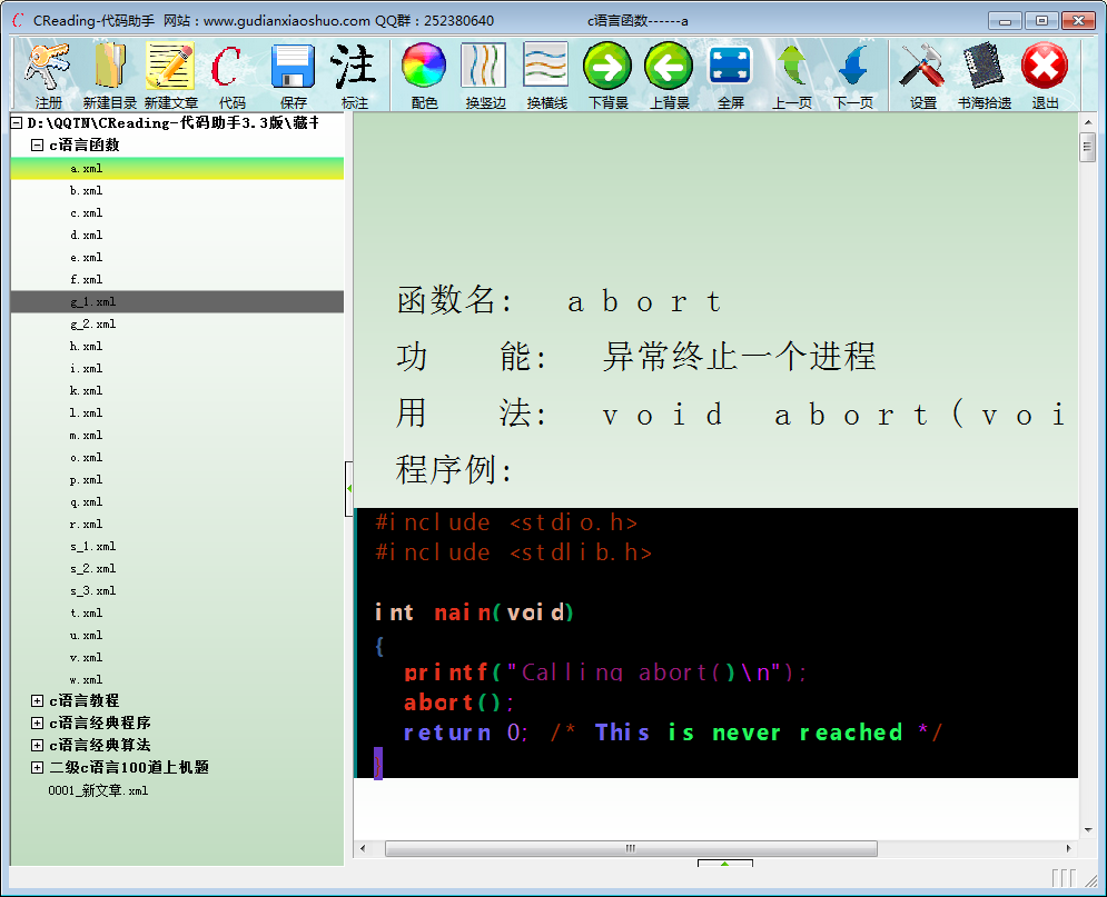 CReading(代码助手)是学习C语言的良好助手 计算机二级必备工具,内含 C语言函数、C语言程序、及经典算法。