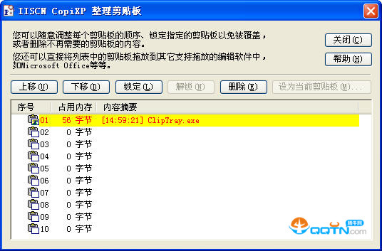 2、提供99个Windows剪贴板,每个剪贴板的功能和操作方式与Windows原有的剪贴板完全相同,支持所有复制、剪切、粘贴操作,支持所有格式的数据(文字、图像、声 音,等等),完全不依赖于任何具体的应用程序;每个剪贴板之间可以手动切换和自动切换,在启动和退出时可以自动保存和还原各个剪贴板,还可以随时调出以前保存的剪贴板,或者保存目前的剪贴板状态。