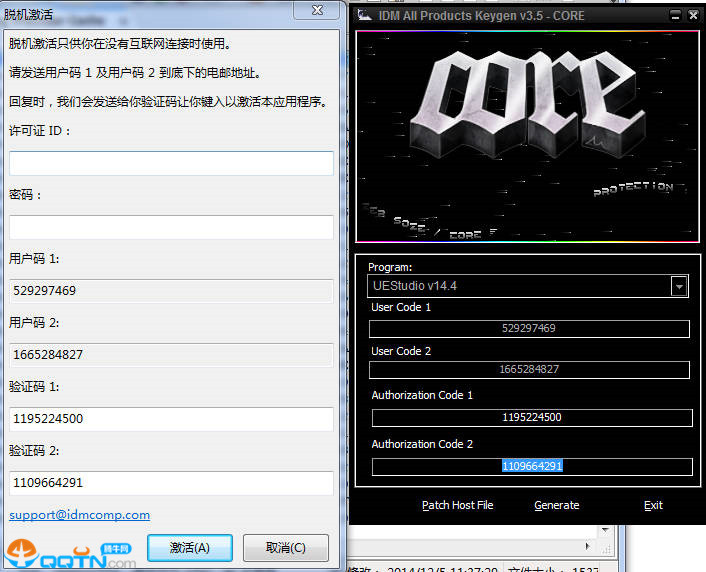 6、许可证ID和密码随意填写 ,然后将用号码1和用号码2输入Kg.exe,然后点击Generate按钮生成验证密匙,将生成的这两个验证密匙依次输入注册窗口中的验证码1和验证码2,然后点击激活即可!注意要选择好程序版本!