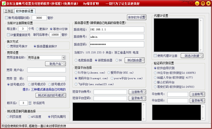 京东注册帐号设置支付密码软件拥有京东帐号注册和账号支付密码设置等功能,接入了手机验证吗平台和打码平台,只需简单设置,即可实现全自动批量完成帐号注册以及支付密码的设置。