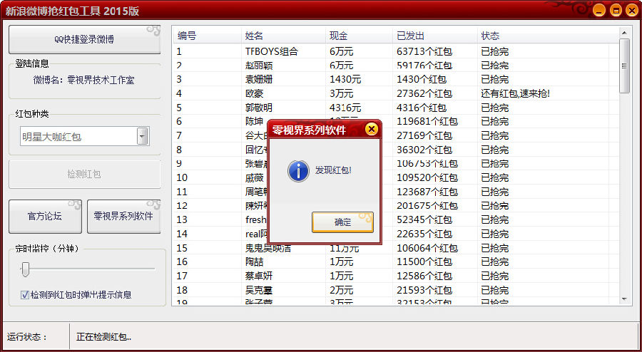 浪微博联手支付宝上演春节抢红包热潮,为此不少网友制作了微博抢红包软件,今天向大家推荐零视界新浪微博抢红包工具,用户可以通过本软件轻松检测红包,便于抢领。