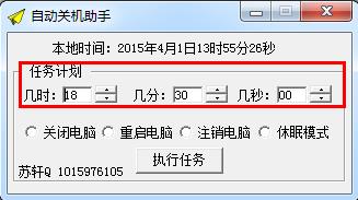 苏轩自动关机助手是一款非常实用的电脑小工具,它绿色小巧易于使用,能够帮助你的电脑进行自动关机,你只需要设置好关机时间,然后选择操作模式,如关机、重启、注销、休眠四种操作选择,接着点击执行任务,然后这款苏轩自动关机助手就能帮助你自动关机啦,欢迎下载使用!