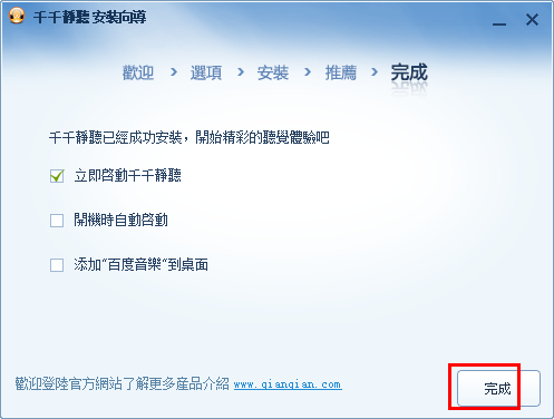 最后一个步骤了,取消你不需要的选项,按下 “完成” 就可以结束千千静听安装程式。