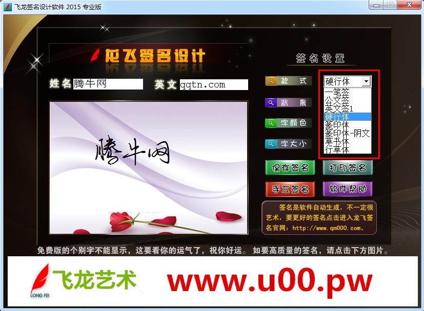 飞龙签名设计软件是一款2015年最新的免费设计签名软件,这款软件可以帮你设计出各种漂亮的艺术签名,飞龙签名设计软件不仅有多种好看的签名字体,如公文签、一笔签等等,而且能自由改变签名背景,基本可以当成你的个人标签或者说是形象代表。制作成电子档后,完全可以当成个人水印或者LOGO使用。欢迎下载!
