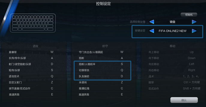 与“FIFA Online 2”传统键盘设定相比,此种控制设定在个别按键上有所不同:”抢断/人墙前冲”由D变为S,”切换球员”由S变为Q,”队友跟防”由Q变为D。